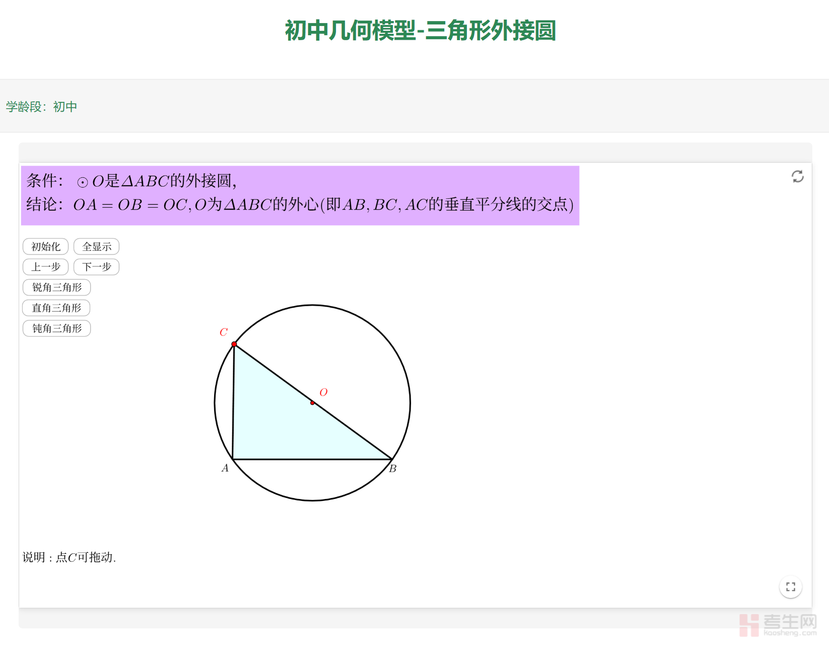 点击 “下一步”:分步展示操作(先观察外接圆与△ABC 的位置关联;再拖动点 C 改变三角形形状,观察外心 O 的位置变化;接着切换三角形类型,验证不同类型下外心的位置特征;最后确认OA=OB=OC的结论),将 “外接圆与三角形的关联观察→点 C 拖动探究形状变化→三角形类型切换验证外心位置→结论验证” 的模型探究过程拆解为操作步骤,适配自主学习节奏。