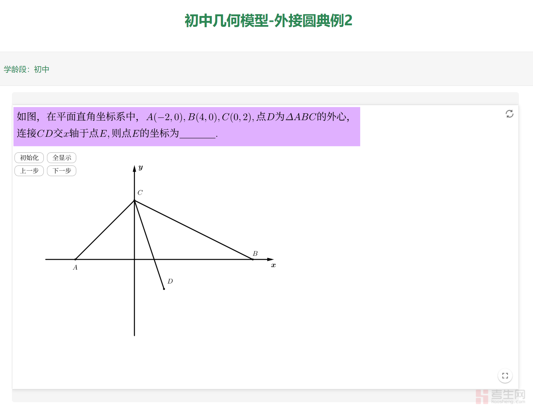点击 “下一步”:分步展示操作(先观察点 A、B 在 x 轴上的位置,确定 AB 的中点,推导 AB 的垂直平分线的横坐标;再设外心 D 的坐标,利用外心到 A、C 距离相等的性质(DA=DC),建立方程求解 D 的坐标;接着结合 C、D 的坐标,推导直线 CD 的解析式;最后令直线 CD 解析式中的 y=0,计算对应的 x 值,定位点 E 在 x 轴上的位置),将 “坐标系中点的观察→外心坐标的求解→直线解析式的推导→x 轴交点的定位” 的探究过程拆解为操作步骤,适配自主学习节奏。